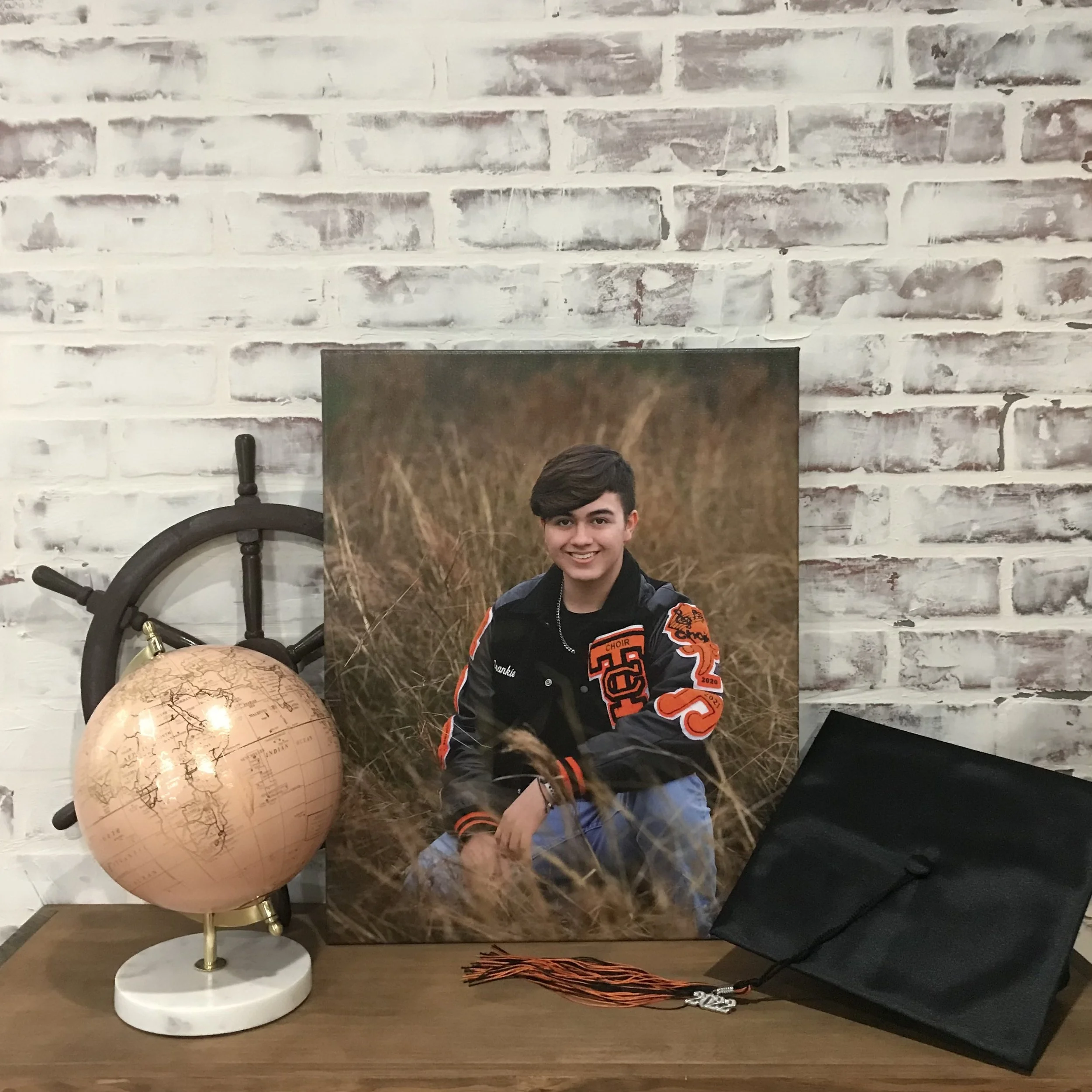 For an approachable casual look, what’s more quintessential than a letterman jacket? I love how the orange patches echo the bright warm tones of the train yard. And, while we LOVE Frankie’s super-hip frames, a few glasses-off shots fully showcase the face at this pivotal age. Oh, the places you’ll go! I’m glad you’ll have all your proof-prints and this wall art to look back on.